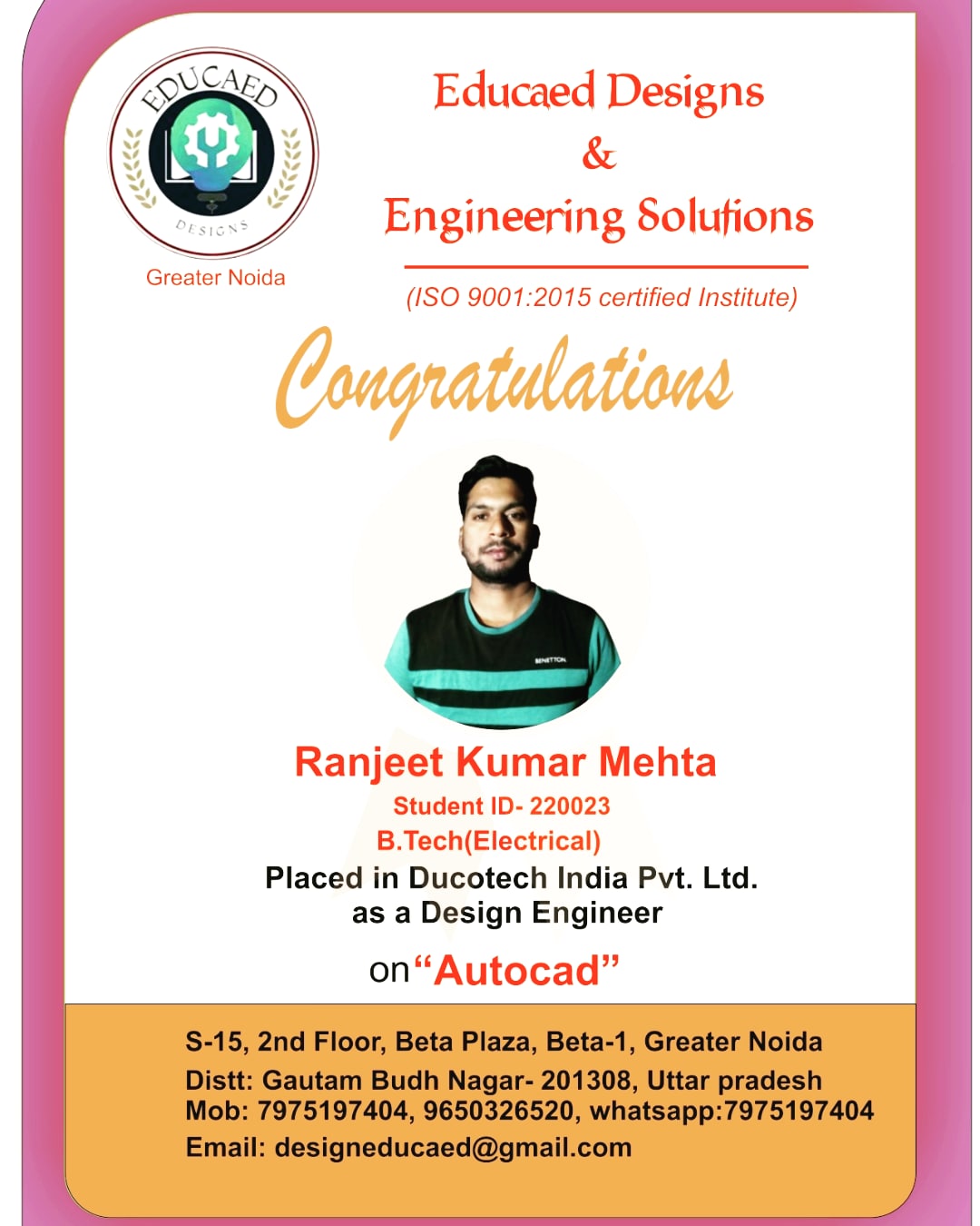 Join the best Autocad, Solidworks & Catia Training with 100% Placement Assistance in Greater Noida.Educaed Design and & Engineering Solutions is one of the best CAD software Training Institute,Provides Advance level Training Courses over different Design softwares related to Mechanical enineering,Civil engineering,Electrical engineering,Interior Designing and Architecture.